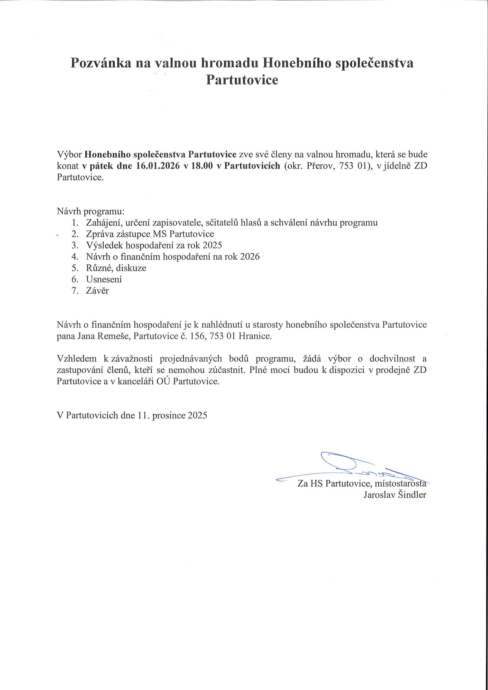 Pozvánka na valnou hromadu Honebního společenstva Partutovice